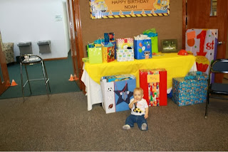 Saturday September 21st was the perfect day for Noah's birthday party! The weather could not have been more perfect! We had his party at our church with family and friends. Since I have no idea what kind of things the boys are into at a year old, I usually do their party how their nursery was decorated. Noah's was a construction theme. Seth's was a sports theme. I had a lot of help from my mom ( who made the used tire sign) and my friend Heather the day of the party with last minute things. And of course spencer was a big help in getting the room set up the night before! Noah loved all the excitement and trying to keep up with the big kids (Seth and his friends). He had a feat time opening all of his wonderful gifts and diving into his cake. He was pretty cautious at first then took some good bites. Eventually some of it ended up in his hair! We had a great day and both boys slept really well that night! We missed our family and friends that weren't able to be there!!